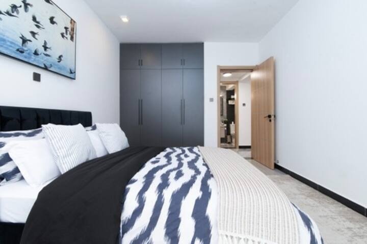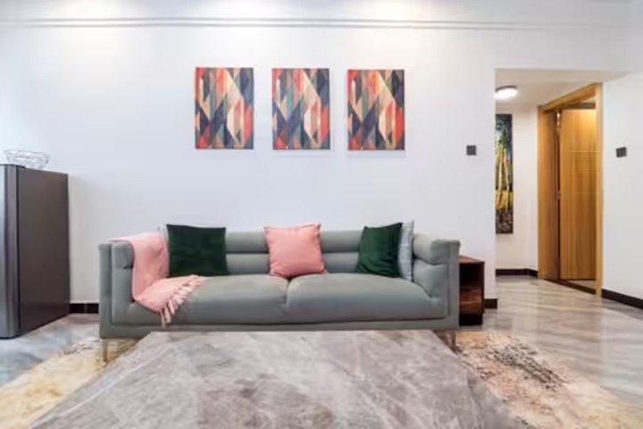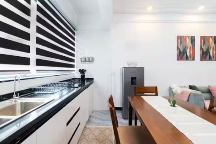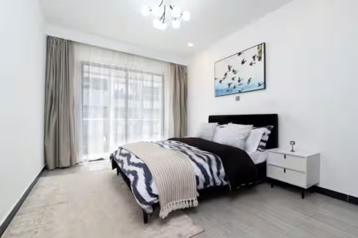 Lounge in a cozy living room with a stylish couch, modern chair, soft lighting, and calming décor. Dine or work at a comfy 6-seater table. Cook with ease in the fully equipped open kitchen. Sleep soundly on a king-size bed with cotton fresh linens. Refresh in a chic, spa-like bathroom and enjoy balcony views. Plus: access to a pool, gym, and kids’ playground. Ideal for couples, solo guests, business trips, or short escapes!