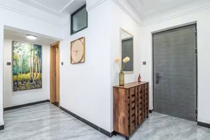 Soft, neutral tones and carefully selected décor pieces bring calm into the space, while recessed ceiling lights, a glowing chandelier, a sleek lamp, and curated wall art create a cozy, elevated ambiance.
