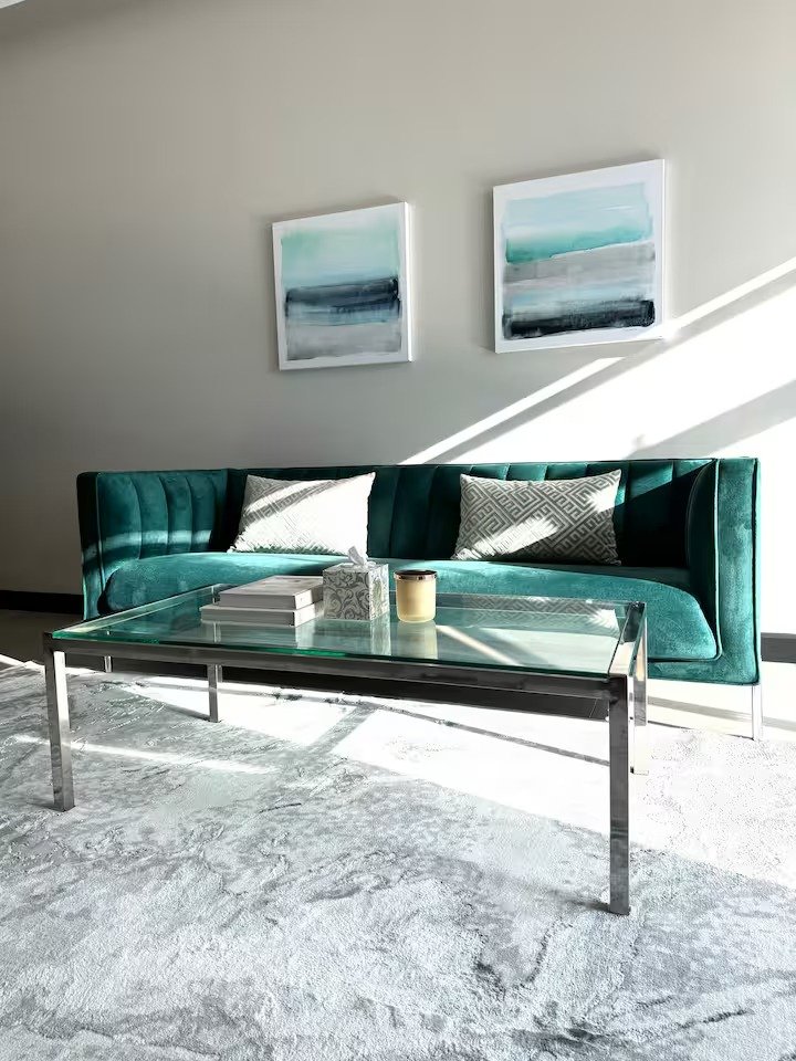 The Bedroom also features glass floor to ceiling windows and a midcentury modern bed, luxury soft mattress, beautiful wall art and a study desk placed right where you can gaze into the city making the feeling of work even more pleasurable.