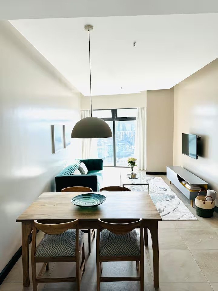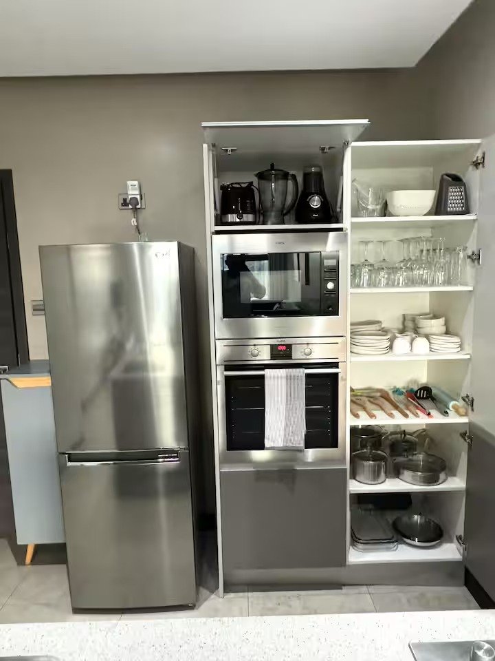 There is a fully fitted – open plan kitchen with 2 high stools on the counter, perfect for hosting a friend or two as you prepare a meal and catch up over a glass of wine. The kitchen appliances are high end from AEG featuring a 4 burner stove top, hood, oven, microwave and dishwasher. Furthermore, the host has thought of every detail to make this a perfect space by provision of champagne flutes, highball glasses, whisky glasses & wine glasses; as well as high end cookware and chinaware. The listing also comes with a 4 seater dining table, with an accent pendant sitting on top of the dining space.