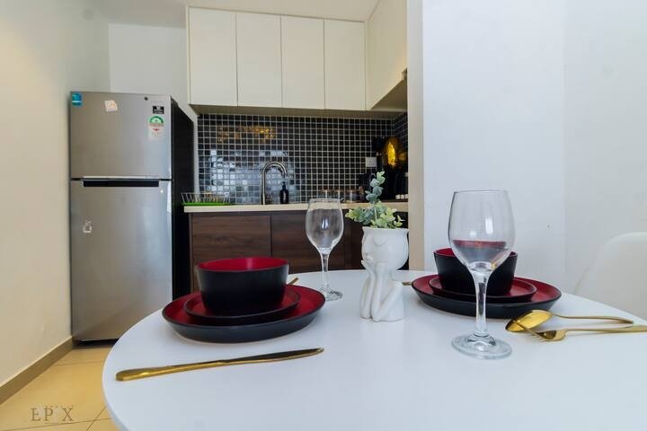 The living room is spacious with large living room window that lets in maximum light and has an open kitchen plan. There is a large balcony with a lovely view from 4th floor and it’s quiet and serene. The sofa can be converted to a bed by joining with ottoman and is indeed comfy. There is 1 large king bed and 1 bath and toilet.