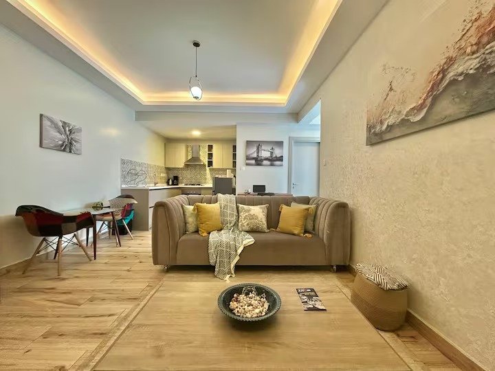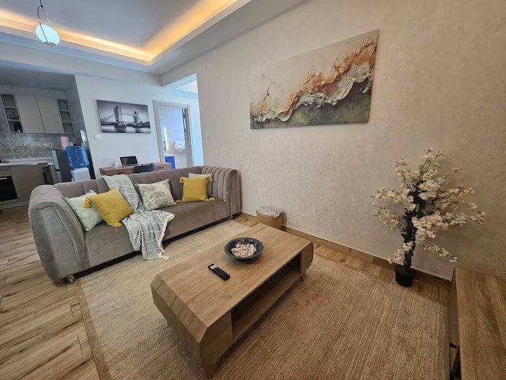 ✅1 living room with a comfortable couch and a 55″ smart TV with Netflix.