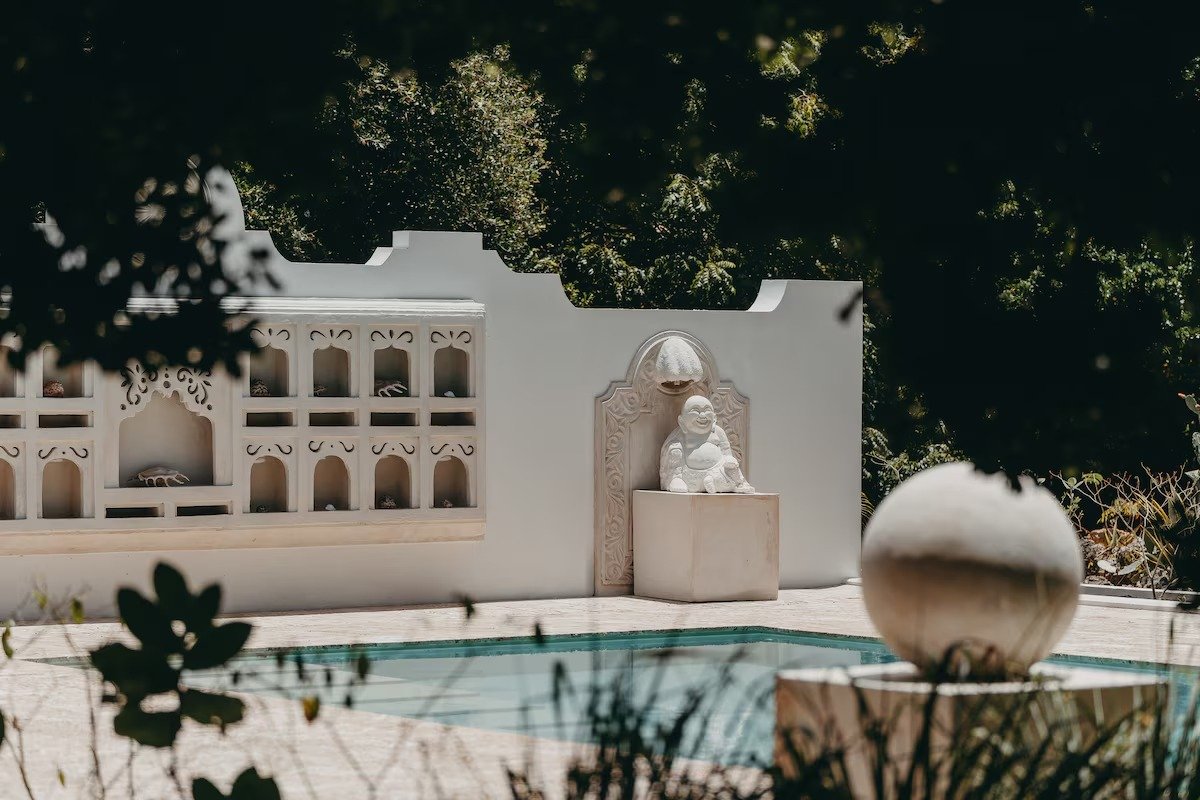 The outdoor eating area is umbrellad by trees, and leads to the shared (with Villa) Buddha pool.