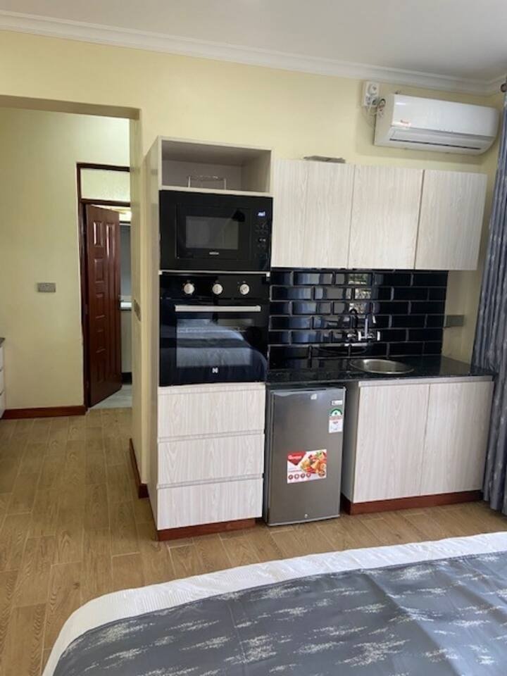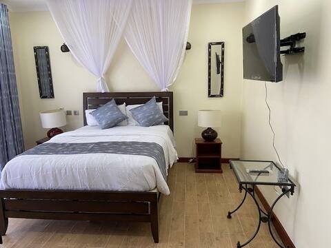 This stylish Lakefront Villa is perfect for a couple or solo stays. View of Kisumu town & Lake Victoria is breaths-taking. You have an induction cooktop and the latest kitchen appliances that the market offers. Cable TV, WIFI & AC available. Huge grounds, Lakefront restaurant, Gift shop, Jetty & boat rides, Horse and camel rides on advance request. 6 additional Villas in this gated property which can be rented together with this villa or separately. 25 mins. to the Airport. 35 mins. to Kisumu.