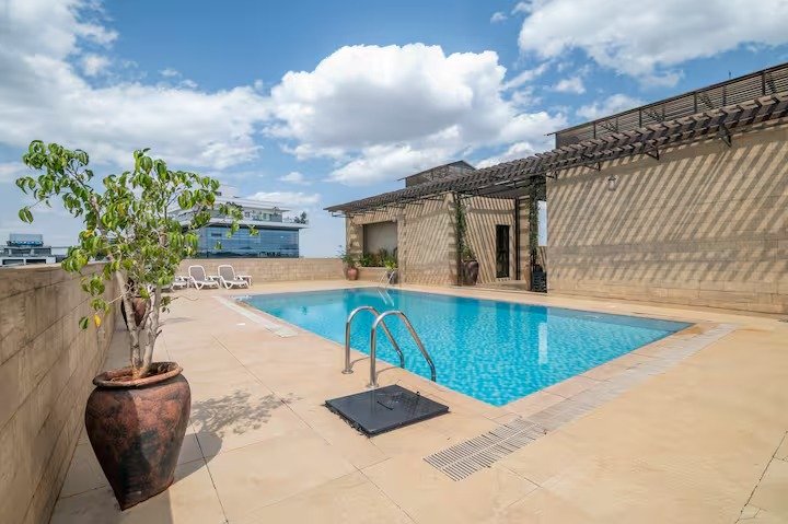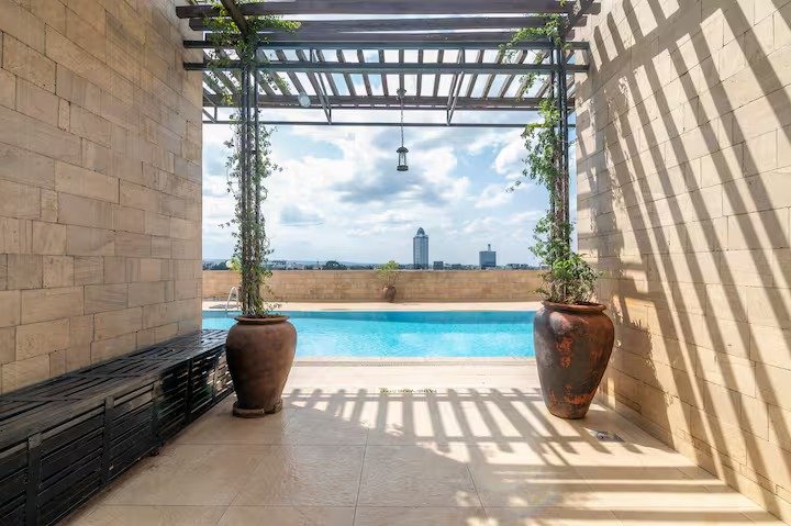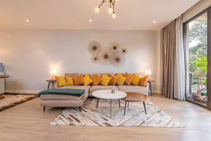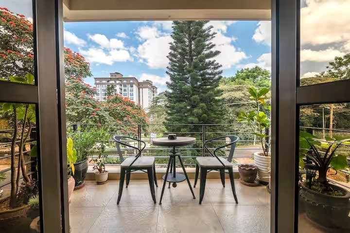 This two-bedroom apartment tucked away in the heart of Westlands is bordered by nature and an urban area filled with plenty of stores and restaurants, giving you the best of both worlds. The space’s bohemian and natural design provides a warm and relaxing living environment. It offers a contemporary kitchen with plenty of counter space as well as an open-concept living area with polished wooden floors and wide couch sets.