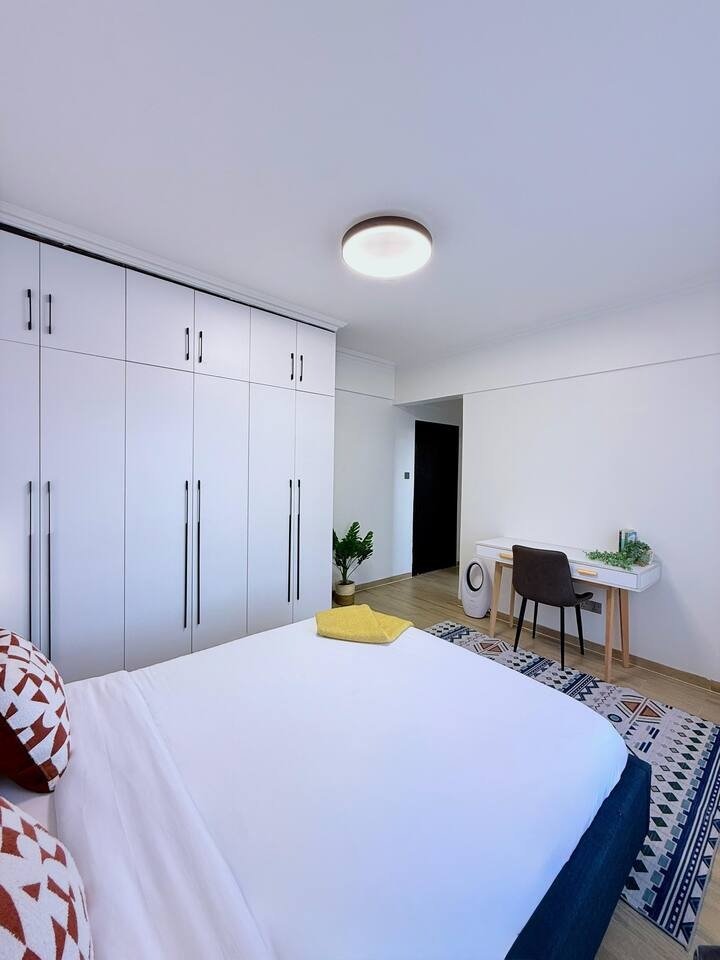 This 2-bedroom apartment in Westlands offers the perfect blend of city convenience and residential comfort. The apartment is located near Nairobi’s best malls, restaurants, and the airport via expressway. Amenities include a rooftop pool with skyline views, a fully-equipped gym, and a lounge with a pool table. The on-site 270 Degrees café serves excellent coffee and meals.