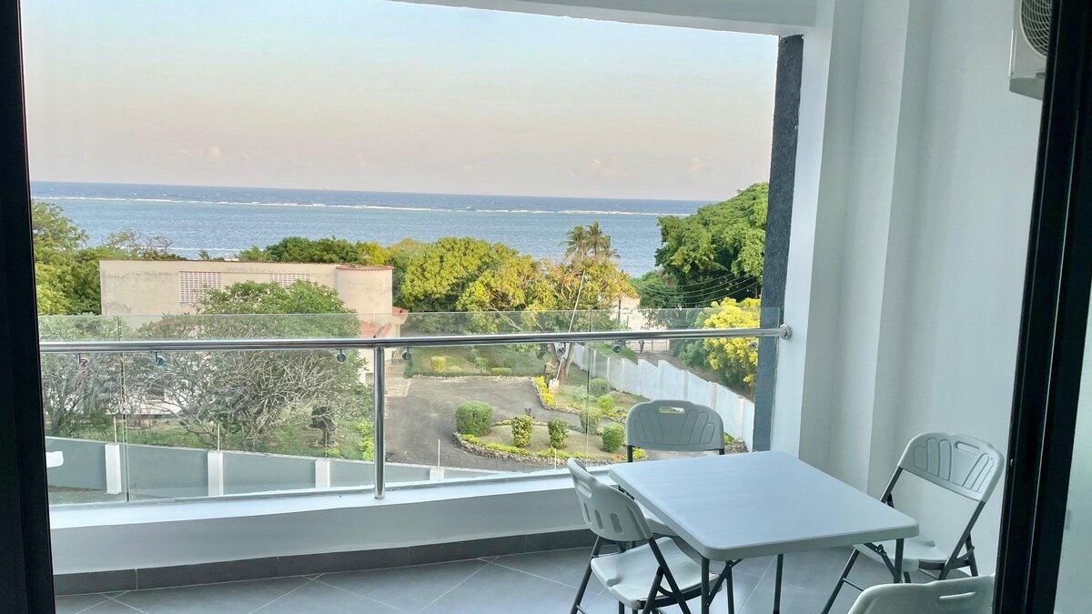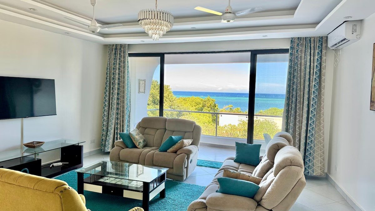 Living room has amazing ocean view and with outdoor table and seats at the balcony.