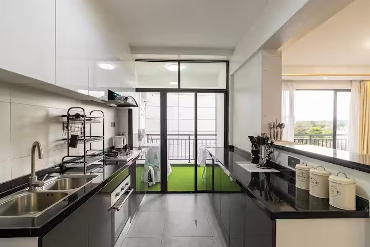 Fully equipped kitchen, washing machine, Dryer, balcony views