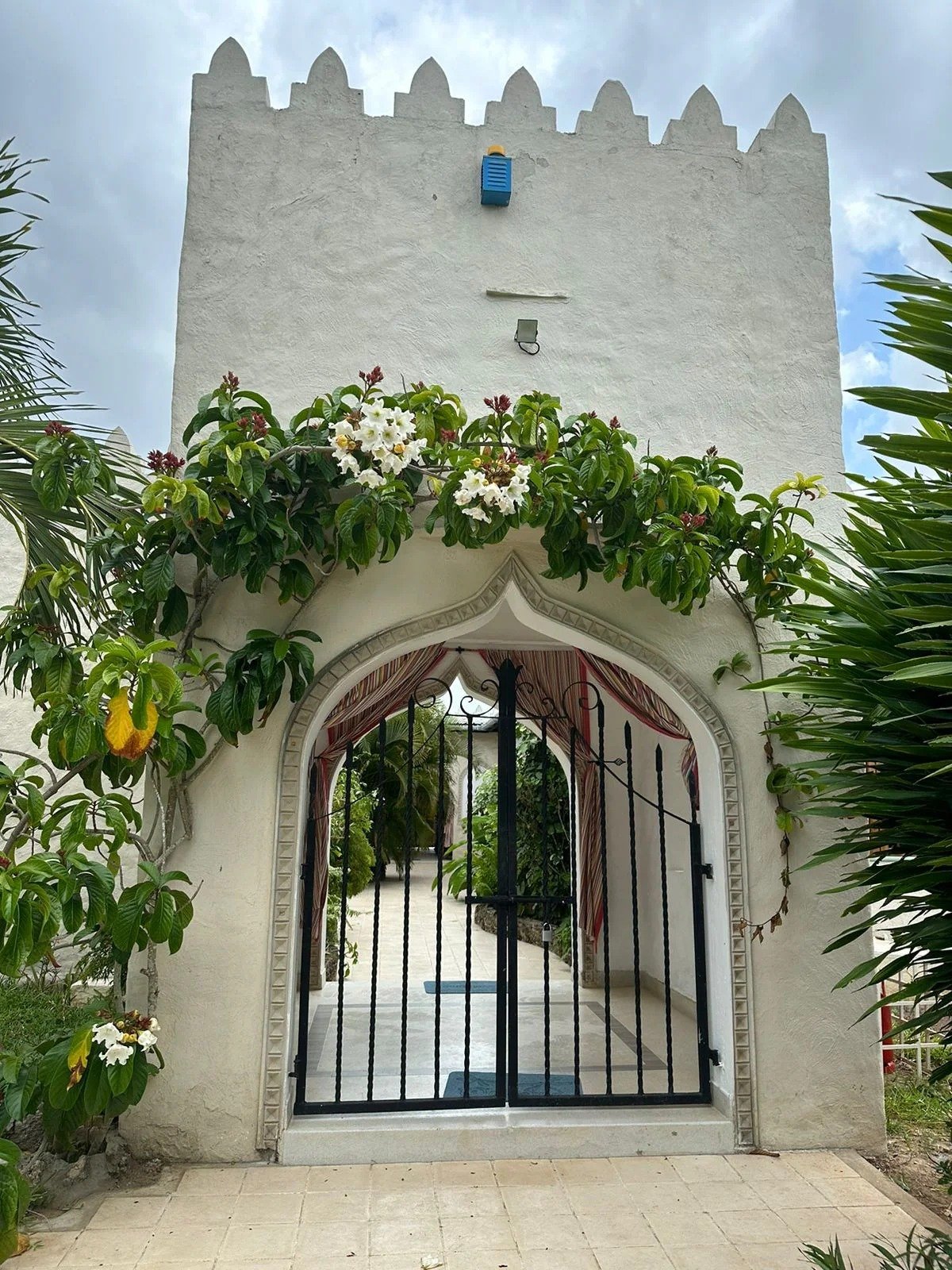 This charming Moroccan-style home offers a serene and spacious getaway, featuring a central courtyard that connects the three bedrooms on one side, with the kitchen and dining room on the other, and a spacious living room and veranda at the front.